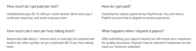 ومن أهم هذه المواقع التي تمت تجربتها وجني الارباح منها موقع Usability Hub وهو عبارة عن موقع مهمته الأساسية ربط المستخدمين بالشركات من خلاله لتقوم هذه الشركات بتحسين جودة مواقعها على الأنترنت عن طريق التجربة وإبداء الرأي من قبلهم حول هذا الموقع وطبعا كل ذلك بمقابل مادي يتقاضاه من جرب هذا الموقع وترك انطباعا له، الفكرة بغاية البساطة لا بد وأنك لاحظت ذلك. وحول صدق هذا الموقع من عدمه فلا بد من التنويه الى ان هذا الموقع قديم ومستمر الى الان وهو يتعامل مع شركات كبرى مثل: Amazon، NASA، Weebly وهذا يدعم مصداقية الموقع طبعا.